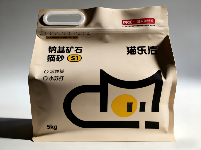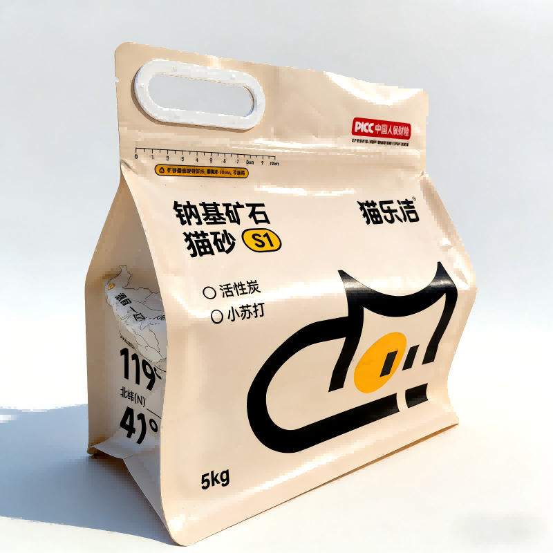 Posestruktur: Den åttesidige forseglingsstrukturen gir en oppreist, stabil form, perfekt for hyllevisning. Den gjenlukkbare glidelåsen og det forsterkede plasthåndtaket muliggjør enkel håndtering og sikker oppbevaring av 5 kg kattesand.