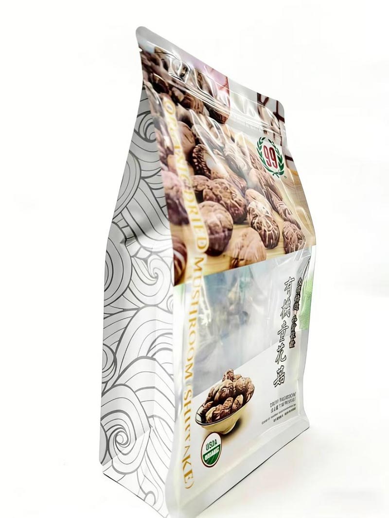Valget av emballasje påvirker lagring og presentasjon av tørket frukt direkte. Hovedtypene av emballasje som er tilgjengelig på markedet inkluderer tre-side-forsegling, fire-side-forsegling, stående poser og åtte-side-forseglingsposer. Blant disse er posen med åtte sider det foretrukne valget. Sammenlignet med andre posetyper har den åttesidige forseglingsposen åtte forseglede kanter, slik at den kan stå oppreist med flat bunn, noe som gjør den ideell for visning i butikkhyllene. Denne vesketypen gir fem sider for merkevarebygging og kan tilpasses med ulike grafikk, noe som gjør den egnet for både detaljhandel og e-handel.